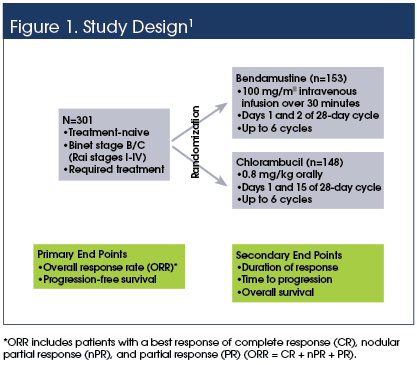 Patients were randomly assigned to receive either bendamustine 100 mg/m2 IV on days 1 and 2 every 28 days or chlorambucil 0.8 mg/kg (Broca’s normal weight) orally on days 1 and 15 every 28 days (Figure 1).1 Up to 6 cycles were administered to each patient.