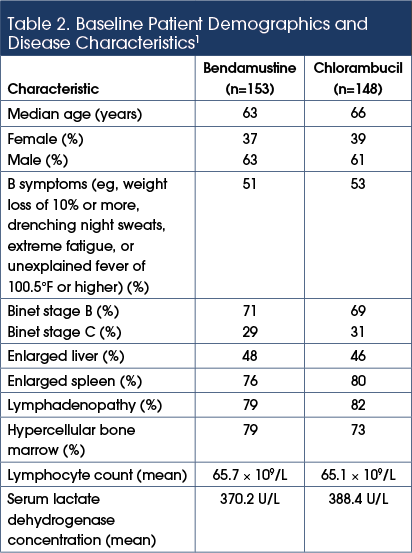 The patient populations in the bendamustine and chlorambucil treatment groups were balanced with regard to baseline characteristics, as shown in Table 2. Ninety percent of patients in both treatment groups had immunophenotypic confirmation of CLL (CD5, CD23, and either CD19, CD20, or both).1