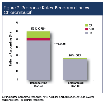ORR was higher in patients in the bendamustine treatment group compared with those in the chlorambucil group (Figure 2). In the bendamustine group, an ORR of 59% (90 of 153 patients) was achieved, with 73 of 153 (48%) achieving a PR, 4 of 153 (3%) an nPR, and 13 of 153 (8%) a CR, while in the chlorambucil group an ORR of 26% (38 of 148 patients) was achieved, with 37 of 148 (25%) achieving a PR, 0 patients an nPR, and 1 of 148 (<1%) a CR.1