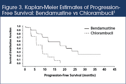 The median PFS (defined as time from randomization to progression or death from any cause) was 18 months (95% CI, 11.7-23.5) for bendamustine versus 6 months (95% CI, 5.6-8.6) for chlorambucil (hazard ratio 0.27; 95% CI, 0.17-0.43; P<.0001).1 Survival data were not mature. Kaplan-Meier estimates of PFS comparing the bendamustine and chlorambucil treatment groups are shown in Figure 3.1