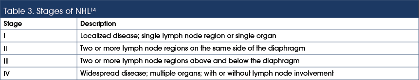 Treatment of indolent NHL depends on the histology and stage of the disease. The stages of NHL are listed in Table 3.14 Because indolent NHL is often asymptomatic in early stages, it is generally advanced (stage III or IV) at the time of detection.