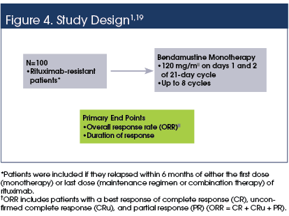 On October 31, 2008, the FDA approved bendamustine for the treatment of patients with indolent B-cell NHL that has progressed during or within 6 months of treatment with rituximab or a rituximab-containing regimen.1 As the basis for its approval, the FDA used the results of a single-arm study of 100 patients with indolent B-cell NHL who had progressed during or within 6 months of treatment with rituximab or a rituximab-containing regimen.19 Patients were included if they relapsed within 6 months of either the first dose (monotherapy) or last dose (maintenance regimen or combination therapy) of rituximab. All patients received bendamustine IV over 60 to 120 minutes at a dose of 120 mg/m2 on days 1 and 2 of a 21-day treatment cycle. Patients were treated for up to 8 cycles (Figure 4).1,19