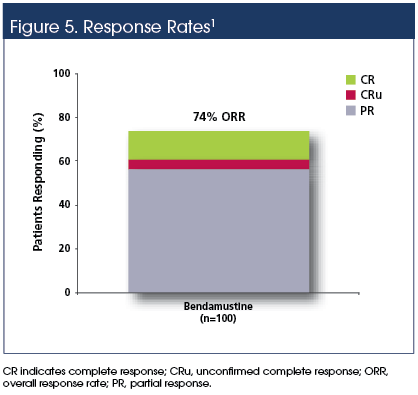 In this population of patients with B-cell NHL who were previously treated with and resistant to rituximab-containing regimens, an ORR of 74% (74 of 100 patients) was achieved with bendamustine monotherapy, with 57 of 100 (57%) achieving a PR, 4 of 100 (4%) a CRu, and 13 of 100 (13%) a CR (Figure 5).1