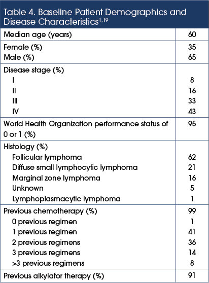 Seventy-six percent of patients had advanced-stage disease at enrollment, and the median number of prior chemotherapy regimens was 2 (range, 0-6 regimens).19 The baseline patient demographics and disease characteristics are shown in Table 4.1,19 Ninety-seven percent of patients had relapsed within 6 months of either the first dose (monotherapy) or last dose (maintenance regimen or combination therapy) of rituximab.1 Efficacy Results