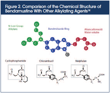 The alkylating activity of bendamustine resides in its mechlorethamine or nitrogen mustard moiety, which resembles the alkylating agents cyclophosphamide and chlorambucil. This is illustrated in Figure 2.