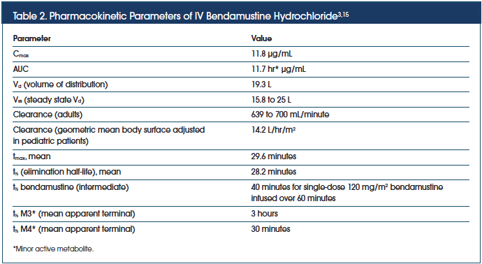 Elimination In preclinical studies, about 90% of radiolabeled bendamustine is recovered primarily in the feces,3 and to a lesser extent in the urine. Nonmetabolized particles make up nearly half of the bendamustine that is excreted in urine.12 Clearance of bendamustine and half-life of bendamustine and minor metabolites M3 and M4 in clinical studies are summarized in Table 2. When bendamustine is administered on days 1 and 2 of a 28-day cycle, little or no accumulation is expected.3