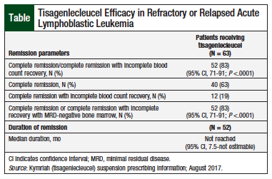In ELIANA, 83% of patients who received tisagenlecleucel therapy had complete remission or complete remission with incomplete blood count recovery within 3 months after infusion (Table).7 All the patients who had complete remission or complete remission with incomplete blood count recovery were negative for minimal residual disease, and 12% of them had stem-cell transplant within 6 months, while still in remission.7 The median duration of complete remission or complete remission with incomplete blood count recovery was not reached by the time of the analysis.7