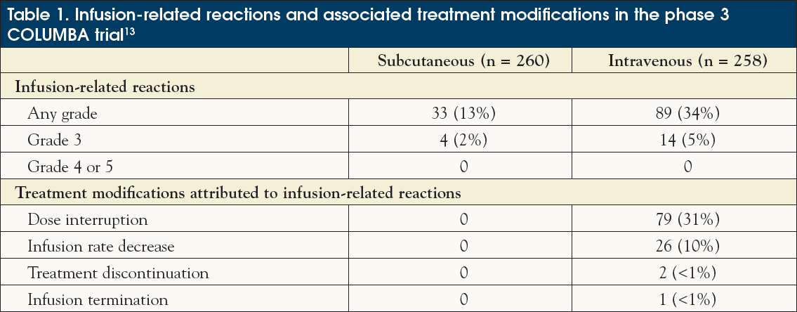 In the IV group, infusion-related reactions led to dose interruptions in 31% of patients, whereas 10% of patients required an infusion rate decrease, 2 patients needed to discontinue treatment, and 1 patient required infusion termination. In sharp contrast, no treatment modifications due to infusion-related reactions were needed in the SC group.13 Although infusion-related reactions were less common with SC administration, a small number of patients (n = 18; 7%) in the SC group did experience an injection-site reaction, most often erythema (n = 4). All of the injection-site reactions were mild, and none required treatment discontinuation.13