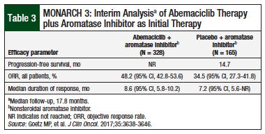 MONARCH 3 was a double-blind, randomized, phase 3 clinical trial that included 493 postmenopausal women (median age, 63 years) with HR-positive, HER2-negative advanced breast cancer who had not previously received systemic therapy in the advanced disease setting. Patients received abemaciclib or placebo plus a nonsteroidal aromatase inhibitor daily.7