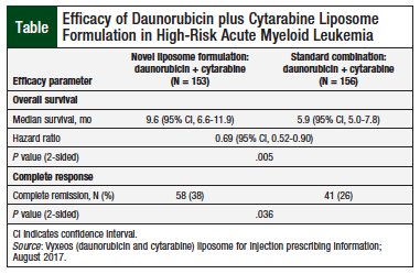 The efficacy of the liposome formulation was established on the basis of overall survival data from the date of study randomization to death from any cause. The median overall survival was 9.6 months in the liposome formulation arm versus 5.9 months in the standard formulation arm (hazard ratio, 0.69; 95% confidence interval, 0.52-0.90; P = .005; Table).9,10 The complete remission rate was 38% versus 26%, respectively (P = .036).9