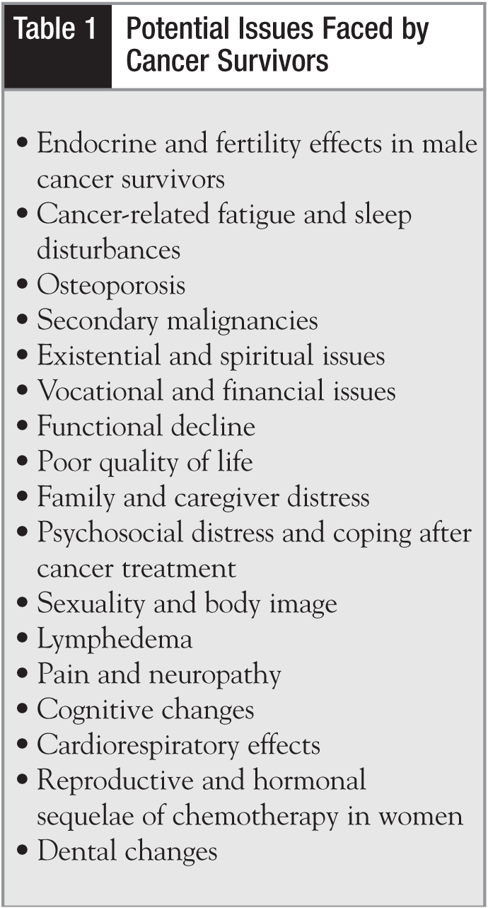 The central tenet of cancer rehabilitation is to help cancer patients and survivors regain and improve their physical, psychosocial, and vocational functioning within the limitations imposed by the disease and its treatment.3 Cancer survivors may be disease-free, but not “free of their disease.” They may face a vast scope of issues, including, but not limited to, fatigue, pain, lymphedema, anxiety, and functional impairments as a result of their cancer or its treatment (Table 1). Therefore, for many cancer patients, returning to “normal” life can be a very difficult transition.