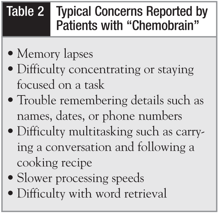 The term chemobrain was coined after breast cancer patients started to notice mental fogginess around the same time they were being treated with chemotherapy. This term has its limitations because many other causes may contribute to cognitive dysfunction among cancer patients, such as depression, hormonal changes, insomnia, and even the cancer itself.10 Nevertheless, the term chemobrain has increasingly become more publicized, particularly among the breast cancer community.11 Although chemobrain was first identified and named by breast cancer survivors, the same constellation of symptoms also affects other cancer patients. A typical patient with chemobrain may report some or all of the concerns listed in Table 2.