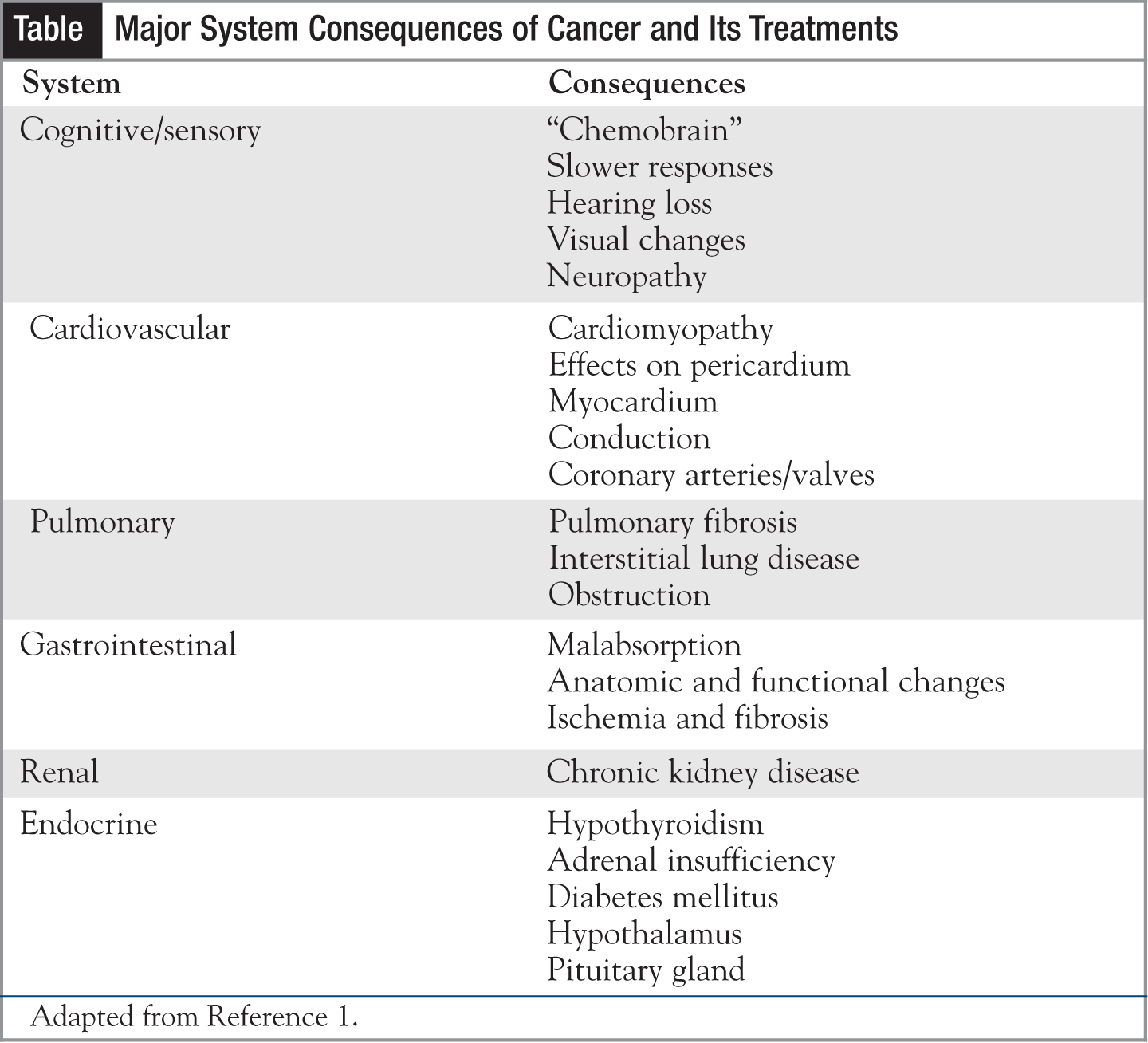 Cancer survivorship can mean different things to different survivors. The consequences of cancer and its treatments can affect individuals in many ways. When patients survive their cancer, the residual effects may severely impact their future health. With survivor issues increasingly studied, evidence is accumulating to help identify consequences associated with particular treatments, such as surgery, chemotherapy, radiation therapy, and immunotherapy. Although the goal of treatment is to extend the life of cancer patients, providers must be equally cognizant of their patients’ quality of life.1,2