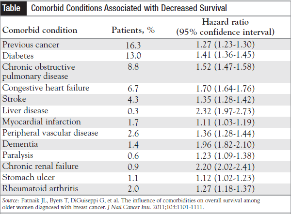 In a US population of 64,034 patients diagnosed with breast cancer at a median age of 75 years, Patnaik and colleagues identified 13 comorbid conditions associated with decreased overall survival and increased all-cause mortality (Table). Among the study population, 58% had none of the selected comorbidities, 28.0% had 1 comorbidity, 8.8% had 2 comorbidities, and 4.9% had ≥3 of the conditions.