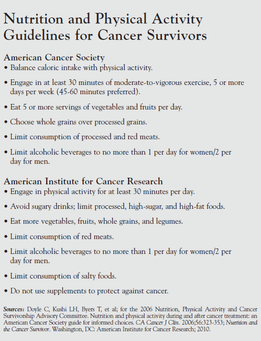 Using the Institute of Medicine’s definition of survivorship, from diagnosis to end of life, Wendy Demark- Wahnefried, PhD, RD, professor and Webb Endowed Chair of nutrition sciences, University of Alabama at Birming ham, and associate director, University of Alabama at Birmingham Comprehensive Cancer Center, summarized the available evidence and guidelines (Sidebar).