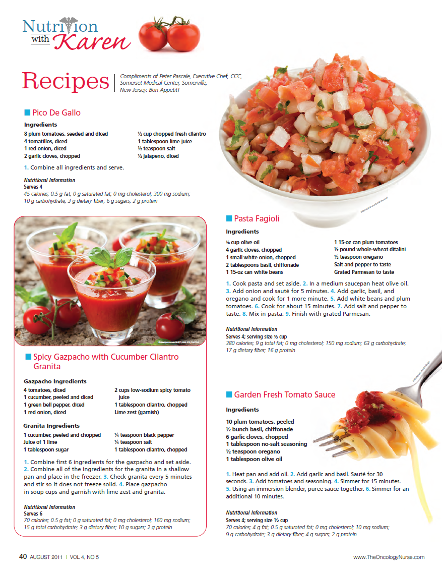 Phytonutrients are naturally occurring compounds found in plant foods such as vegetables, fruits, grains, legumes, and nuts. These compounds help enhance the immune system and protect the body against chronic illness. One of the tomato’s phytonutrients has been studied extensively—lycopene. As a member of the carotenoid group, lycopene gives plants their red, yellow, and orange pigments. In addition, carotenoids are fat-soluble, which means that to optimize absorption they need to be consumed along with a source of fat. For example, using oil and vinegar dressing on a tomato salad will provide a sufficient amount of fat to aid absorption of the lycopene. A piece of low-fat mozzarella consumed with a slice of tomato also is an acceptable combination. Unlike other foods, cooking the tomato increases its anti oxidant content and the bioavailability of lycopene.
