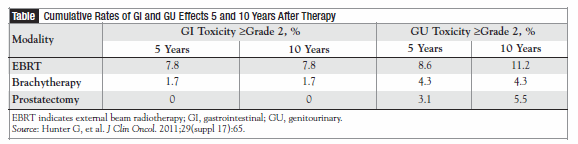 Some men with prostate cancer who undergo external beam radiotherapy (EBRT), interstitial brachytherapy, or radical prostatectomy show evidence of toxicity for at least a decade after the procedure. Grant Hunter, MD, a third-year urology resident at the Cleveland Clinic in Ohio, led the retrospective study and presented findings at the meeting. He said all 3 modalities resulted in gastrointestinal (GI) and/or genitourinary (GU) toxicities up to 10 years later, with the most severe profiles observed in patients with diabetes mellitus (Table). “The findings from this study should be of special interest to oncology nurses,” said Hunter, who noted that many clinicians might not be aware of the potential for late-term effects related to these therapies.
