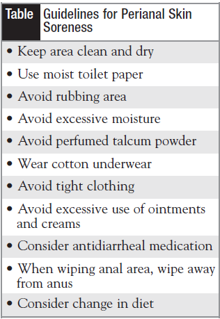 Perianal skin soreness should be addressed (Table). Nurses should review and adjust diet and fluid intake (caffeine, alcohol, fiber) and medications, consider prescribing an antidiarrheal (loperamide, titrated closely) and glycerin suppositories (to aid in complete evacuation), and address toilet access. Behavioral techniques can be very helpful. Patients should train themselves to wait at least 5 minutes before toileting when they feel the urge, and to perform “control” exercises 10 times a day.