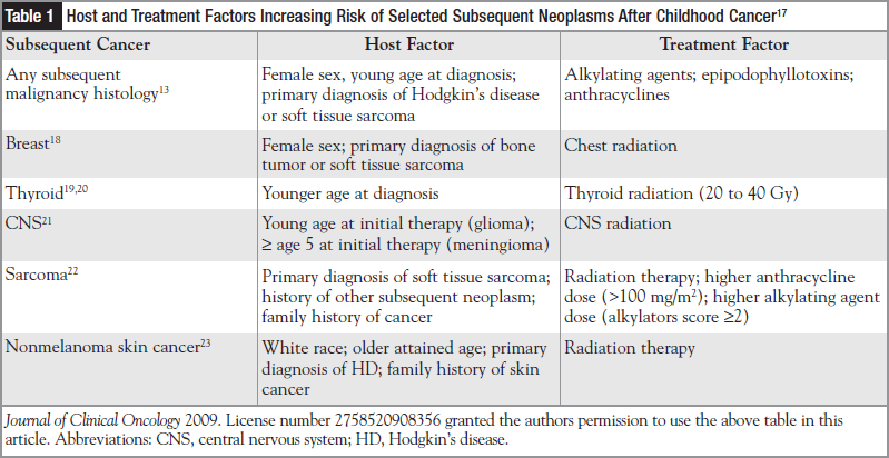 The most common secondary neoplasms include breast cancer, skin cancer, thyroid cancer, treatment-related myelodysplasia or leukemia, lung cancer, central nervous system (CNS) tumors (including meningiomas), and bone cancers and soft tissue cancers. It appears that there are certain diagnoses, therapeutic exposures, and other characteristics that may increase the risk of secondary neoplasms in this population. Table 1 identifies host and treatment factors increasing the survivor’s risk of subsequent neoplasms.17-23 Survivors with genetic predispositions, including those with a family history of early-onset cancers, are more at risk than the general population. Survivors exposed to radiation to the head and neck are at increased risk for secondary malignant neoplasms. There is an increased risk of breast and lung cancer, particularly in female survivors who received mantle or chest radiation. Secondary skin cancer is commonly a basal cell carcinoma. The risk of thyroid cancer is greater in females and in those whose time from initial cancer therapy is greater than 10 years. Radiation-associated risks remain elevated for at least 20 years postradiation exposure and in doses ≥25 Gy.17 Secondary lung cancer occurs more often in survivors exposed to prior chest radiation. CNS tumors can also include relapsed CNS leukemia. Bone and soft tissue cancers occur more often in survivors of primary sarcomas. Survivors exposed to radiation and higher cumulative doses of anthracyclines and/or alkylating agents also appear to be at higher risk for the development of a secondary neoplasm. Prior exposure to alkylating agents (cyclophosphamide, ifosfamide, cisplatin, carboplatin, busulfan, melphalan, nitrogen mustard, and procarbazine), epipodophyllotoxins (etoposide), and anthracyclines (doxorubicin) increases the risk of secondary leukemia. The speculated latency period for secondary leukemia onset for alkylating agents is 4 to 7 years, whereas the latency period is much shorter for epipodophyllotoxins, at 1 to 3 years.15 In addition to primary cancer diagnosis and treatment, lifestyle and environmental factors may impact the development of secondary neoplasms in this population. These risk factors include exposure to smoking and chewing tobacco, alcohol consumption, lack of exercise, diet, and the use of reproductive hormones.