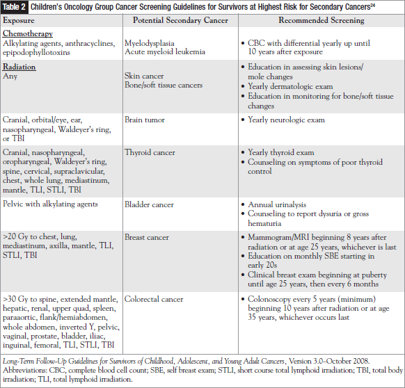 There are specific guidelines for recommended screen ing to detect secondary malignancies in this population based on treatment exposures. If a hereditary predisposition for a secondary cancer is suspected (eg, genetic form of retinoblastoma, embryonal tumors, Wilms’ tumor, neuroblastoma), genetic counseling and testing may lead to interventions that could prevent future cancers.25 Table 2 provides a summary of a childhood cancer survivor’s potential exposure, risk of potential secondary neoplasms, and the current screening guidelines as recommended by the COG guidelines.24 Adherence to screening guidelines directed at the general population is of particular importance among averagerisk survivors.26 These screening guidelines are published by the US Preventive Services Task Force27 and Debra Schmidt, RN, the American Cancer Society.28