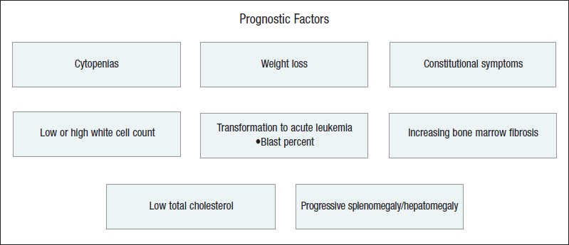 Approximately one-quarter of patients with IMF are asymptomatic at the time of diagnosis.8 Patients who are symptomatic may present to the primary care provider with complaints of fatigue, weakness, shortness of breath, and weight loss. Some patients may also complain of left upper quadrant pain or discomfort due to splenomegaly.8 Lab values can be very broad. Normocyticnormochromic anemia is present in almost all patients. In 1 study the hemoglobin concentration in patients at diagnosis was 9.5 to 11.6 g/dL, with a range of 4 to 20 g/dL among a total of 539 patients in 4 studies.8 Anisocytosis (variation in size) and poikilocytosis (variation in shape) are constant findings, as are teardrop-shaped red cells.7 Prognosis worsens with increased presence of the clinical manifestations listed above and shown in the Figure.9 In 2008, WHO recommended 2 sets of specific criteria (major and minor) to help clinicians make an accurate diagnosis (Table 2).10