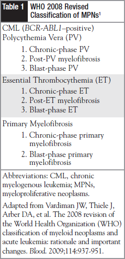 Myeloproliferative neoplasms (MPNs) are somewhat rare chronic hematologic malignancies. There are no known cures, but the disease itself is treatable. According to the World Health Organization’s revised WHO Classification of Tumors of the Hematopoietic and Lymphoid Tissues, MPNs include essential thrombocythemia (ET), polycythemia vera (PV), and idiopathic myelofibrosis (IMF), also referred to as primary myelofibrosis (Table 1).1 IMF, ET, and PV are considered Philadelphia chromosome (Ph) negative. Chronic myelogenous leukemia (CML) is considered Ph positive. This review article will focus on IMF, and the new treatment approved by the US Food and Drug Administration (FDA).