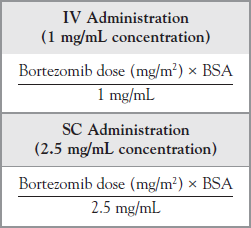 The recommended starting dose of bortezomib is 1.3 mg/m2, administered intravenously (IV) over 3 to 5 seconds at a concentration of 1 mg/mL, or subcutaneously (SC) at a concentration of 2.5 mg/mL.4 Additional details about the new SC indication will be discussed in a later section of this article. Consult the full prescribing information at www.velcade.com for detailed dosage and administration guidelines.