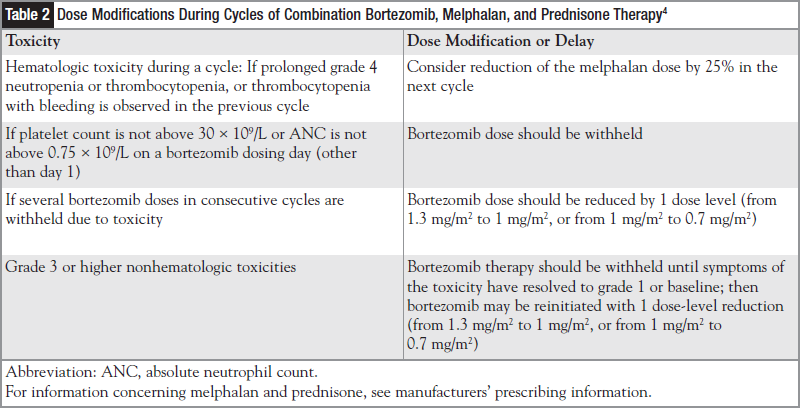 The manufacturer’s recommended dose-modification guidelines for bortezomib-associated hematologic toxicities are listed in Table 2.