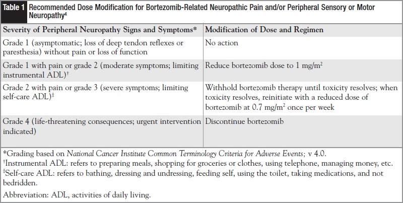 Patients receiving bortezomib may complain of feeling cold, a burning sensation, and/or tingling/numbness in their extremities, the classic stocking and glove distribution.11 Dose modification guidelines found in the prescribing information should be followed when patients report or are found to have grade 2 neuropathy or grade 1 associated with pain, as listed in Table 1.