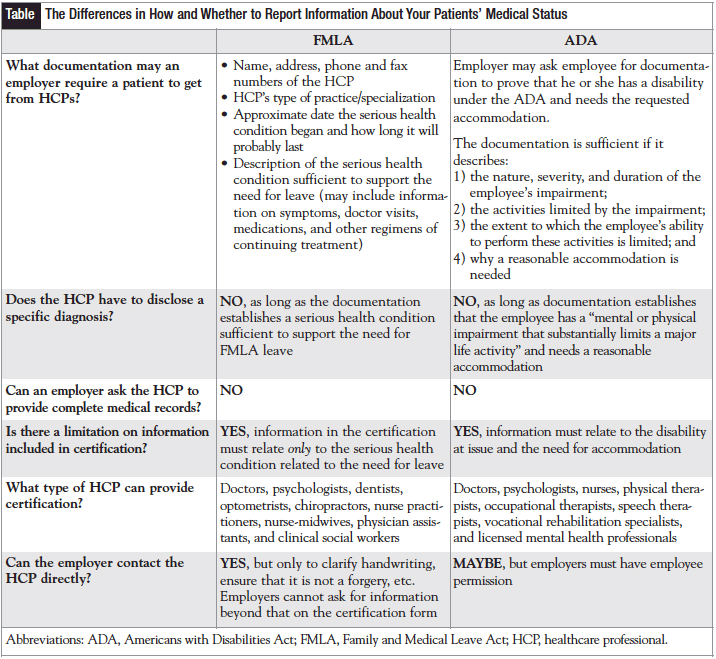 In either case, if a patient is not able to provide this information to the employer, the employer can deny the leave or accommodation. However, where employment-related medical certifications are concerned, less is often more. Although many employers would never discriminate against an employee because of his or her medical history or cancer diagnosis, unfortunately some would. To ensure that all patients are protected against unnecessary discrimination, best practices dictate that HCPs should give just enough information to address the patients’ goals with the employer, but not give the employer too much information that may be used against the patient as an employee. The Table highlights the differences in how and whether to report information about your patients’ medical status.