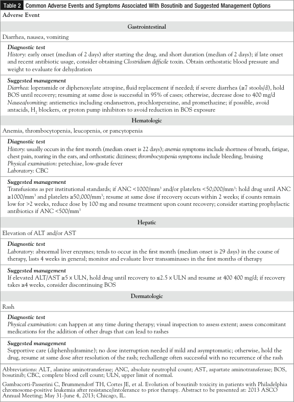 Adverse Events and Management Common adverse events associated with the use of bosutinib are summarized in Table 2. Overall, bosutinib is well tolerated, and adverse events are often transient, manageable, and rarely result in drug discontinuation. The most common nonhematologic adverse events are gastrointestinal, and include diarrhea (84%), nausea (44%), and vomiting (35%).14 The mechanisms that lead to diarrhea are unknown; however, the pattern is very predictable: early onset (median of 2 days) after initiation of bosutinib in the majority of cases is grade 1 to 2 (75%) and lasts a median of 2 days. Antidiarrheals (ie, loperamide or diphenoxylate atropine) are very effective. If bosutinib needs to be temporarily held, resumption of the drug is usually not associated with diarrhea recurrence. Diarrhea is rarely grade 3 to 4 (9%), is very infrequently chronic, and led to bosutinib discontinuation in only 1% of patients in clinical trials.