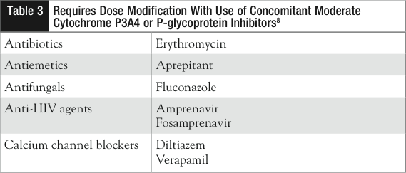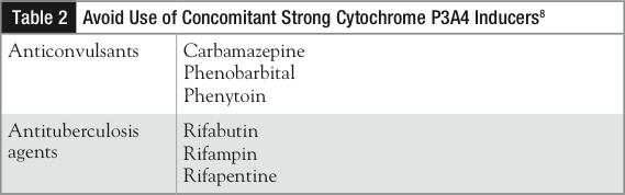 Agents that inhibit cytochrome P (CYP) 3A4 (Table 1) can increase everolimus blood concentrations, whereas CYP3A4 inducers (Table 2) can decrease blood concentrations. Patients should report all medications including dietary supplements and should not start any new medications without contacting their healthcare professionals. Coadministration with strong CYP3A4 inhibitors and inducers should be avoided. When coadministering with a moderate CYP3A4 inhibitor (Table 3), dose adjustments are recommended. Everolimus should be reduced to 2.5 mg daily if coadministration is required. If the moderate inhibitor is discontinued, a washout period of approximately 2 to 3 days should be allowed before the everolimus dose is increased. If the moderate inhibitor is discontinued, the everolimus dose should be returned to the dose used prior to initiation of the moderate CYP3A4 inhibitor. Grapefruit, grapefruit juice, and other foods that are known to inhibit CYP450 and P-glycoprotein activity may increase everolimus exposure and should be avoided during treatment. An increase in everolimus is recommended if use with a strong CYP3A4 inducer is required; it should be increased from 10 mg daily up to 20 mg daily, using 5-mg increments.8