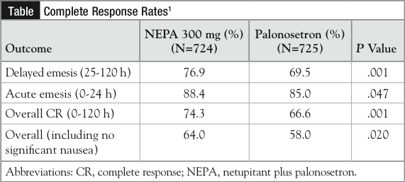 The primary end point of this study was complete response during the delayed phase (ie, 25 to 120 hours post chemotherapy). “NEPA showed superior complete response rates as compared to palonosetron during the delayed, acute, and overall phases,” Aapro reported (Table). “NEPA was also superior to palonosetron during the delayed/overall phases for complete protection, no emesis, and no significant nausea.”