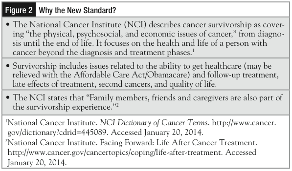 When asked to rationalize this standard, Ferris recalled the 2005 Institute of Medicine (IOM) report, “From Cancer Patient to Cancer Survivor: Lost in Transition.”2 The transition of cancer survivors from oncology practices to primary care practitioners (PCPs) has been identified by IOM as a significant area of unmet need. Today, more than 13.7 million cancer survivors need specialized follow-up care that includes monitoring of late effects of cancer treatment, surveillance for secondary cancers, and initiatives that optimize their quality of life.