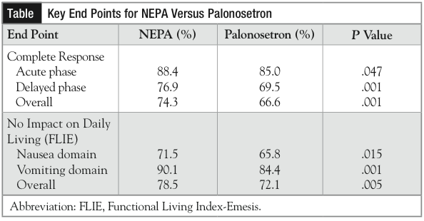 “NEPA showed superior complete response rates during the acute, delayed, and overall phases following chemotherapy compared with palonosetron. This superior prevention of CINV correlated with a significantly greater proportion of NEPA-treated patients experiencing no impact on daily living as a result of CINV, based on all domains of the FLIE,” Rugo reported. See the Table.