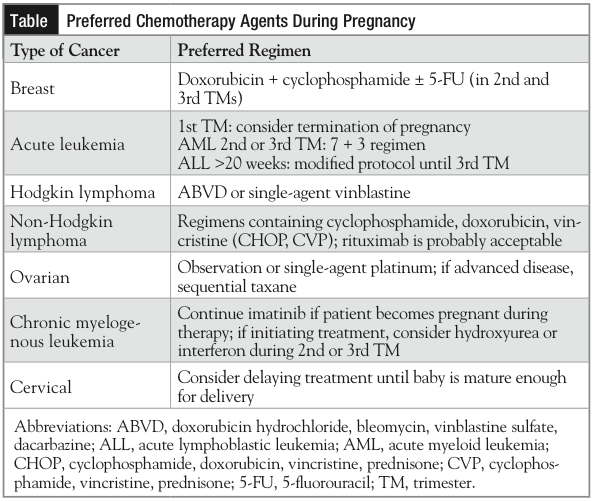 Hochard also shared her list of preferred agents for the common cancers that occur in the pregnant population (Table).