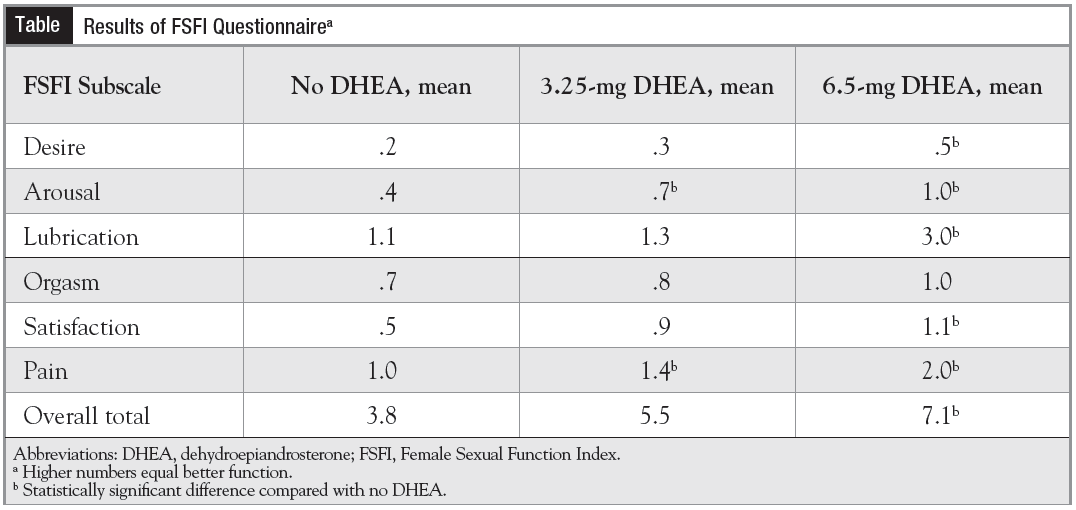 Vaginal dehydroepiandrosterone (DHEA) may improve sexual function, without negative systemic effects, in women with breast and gynecologic cancer with vaginal and sexual-related complaints. Breast and gynecologic cancer patients can experience a range of symptoms associated with sexual dysfunction, among them vaginal dryness and dyspareunia. According to findings presented by Debra Barton, RN, PhD, AOCN, at the Multinational Association of Supportive Care in Cancer/International Society of Oral Oncology 2014 annual meeting, effective treatment is needed for female sexual dysfunction associated with breast and gynecologic cancer, and vaginal DHEA has proven beneficial. Current Interventions The vagina is highly regulated by estrogen. “When estrogen is depleted it leads to changes in vaginal tissues, resulting in a vagina that is dry, uncomfortable, and susceptible to infections,” said Barton, professor and the Mary Lou Willard French Endowed Chair in Oncology at the University of Michigan School of Nursing in Ann Arbor. The focus of treatment for vaginal symptoms is local, noted Barton. Current evidence-based interventions include lubricants, which are used solely for the purpose of reducing friction during intercourse, and vaginal moisturizers, which are used several times a week and for the purpose of hydrating vaginal tissue. Vaginal estrogen is the gold standard for treatment, but it is a last resort in women with cancer due to safety concerns. “There is a need for effective treatment without systemic estrogenic effects,” Barton said. DHEA—A Possible Solution “One possible solution is DHEA,” said Barton. DHEA is a prohormone made by the adrenal gland. A prohormone has no known activity in and of itself but has to be converted, mostly in target tissue, to either estrogens or androgens. Previous work with DHEA has supported the hypothesis that when used vaginally it does not produce systemic effects. Barton and her colleagues conducted a study on postmenopausal women with a history of breast/gynecologic cancer who had completed chemotherapy and radiation and had no evidence of disease. Women were eligible if they reported at least moderately severe vaginal complaints present for no less than 2 months. This analysis of secondary physiological end points examined the impact of vaginal DHEA on vaginal health, hormone concentrations, bone turnover, and sexual function. A total of 464 women were accrued from 82 sites; 21 withdrew prior to randomization and 2 could not classify worst symptom. The remaining women were randomized to study arms of 3.25 versus 6.5 mg of DHEA versus plain moisturizer (PM). DHEA was compounded into a bioadhesive vaginal moisturizer gel, which was designed to adhere to the vaginal wall. Women inserted the DHEA using a prefilled syringe nightly for 12 weeks, just before sleep and subsequent to any sexual activity. Laboratory tests, maturation index, and vaginal pH were evaluated at baseline and again at 12 weeks. Safety and Physiological Effects Blood samples were taken from the 147 women on each of the 3 study arms; a total of 47 women provided pre- and postvaginal tissue samples. Women in all arms experienced a decrease in pH, which is the desired direction, with a greater decrease in the DHEA arms. While none in the control arm (who had levels >5 at baseline) achieved a pH 5, this lower level was achieved by 9% with DHEA 3.25 mg and 7% with DHEA 6.5 mg. Vaginal cell maturation (no intermediate superficial cells vs some/any) was observed in 100% receiving DHEA 3.25 mg, 86% with DHEA 6.5 mg, and 64% with PM. Regarding systemic hormone concentrations, DHEA levels increased in each DHEA arm, significantly different from the PM group. However, while the increases were considered to be significant, these values at 12 weeks were not out of line with the normal range for women in that age group, Barton explained. Bone biomarkers were essentially unchanged. “Based on our data, there is no evidence that vaginal DHEA was having effects on the bones,” she added. A lack of effect on bone markers indicates the absence of estrogenic activity. DHEA—Did It Work? In all arms, a significant reduction in the primary symptom was observed compared with baseline, with severity reduced by almost half, and there were no significant differences between the study arms. “However, the 2 doses of DHEA did significantly improve sexual function, with the 6.5-mg dose improving every single subscale of sexual function except for orgasm,” Barton noted (Table). Self-reported adverse effects included vaginal discharge, which was experienced by women in all 3 arms, as well as voice change experienced by women in the DHEA arms. “In concert possibly with the testosterone levels, we did see some evidence of androgenic side effects, with voice change being statistically different in the DHEA arms compared to moisturizer, although these differences are quite small,” added Barton. This study provided evidence of some systemic absorption of DHEA accompanied by hormone changes, although these changes were small and concentrations for all hormones still stayed in the lower normal ranges. Based on the bone biomarker data, there was no indication of extravaginal effects of the DHEA. The adverse and physiological effects led to the hypothesis that vaginal DHEA is working through androgenic means at the site of the vagina, with only minor systemic androgenic effects. Based on these data, Barton and her colleagues concluded that DHEA improved physiological vaginal health and overall female sexual function more than did PM alone.