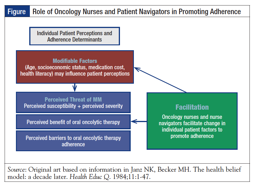Perceived susceptibility is defined as patients' beliefs about their risk of disease progression, symptom worsening, and survival with and without medication, whereas perceived severity is patients' beliefs on the extent of their disease severity; together, they account for the perceived threat of myeloma.20 This understanding is essential for patients to make a change in their adherence behavior. Oncology nurses and nurse navigators need to work with patients to educate them about the disease threat based on patients' baseline levels of understanding. On a related note, perceived benefits refer to patients' understanding of the short-and long-term efficacies of their prescribed oral oncolytics for myeloma control; perceived barriers are patient-specific barriers to medication adherence.20 Oncology nurses and nurse navigators need to identify and address individual barriers, and convey that the benefits of medication adherence outweigh the barriers.