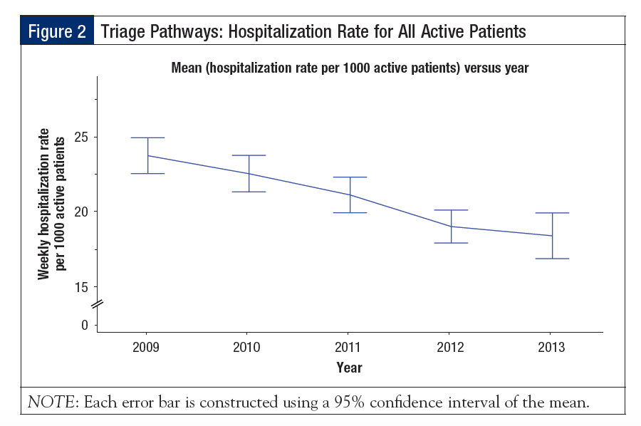 The triage pathways have paid off in the form of fewer hospitalizations for all active patients (Figure 2). The overall patient satisfaction rate was a median of 91%.