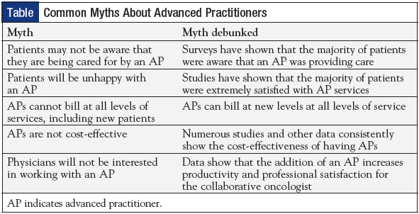 Practices for each type of AP vary, and there are several practice models. The most important concern for APs in oncology care is being able to practice in a supportive, nonrestrictive environment. The mentoring and support of physicians in the practice are key components of professional growth and satisfaction.