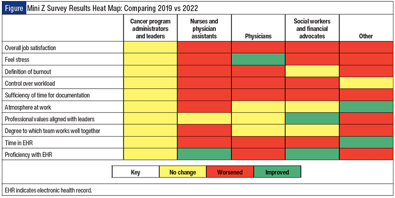 Overall, among cancer program administrators and practice managers, there was no significant change in outcomes and indicators of burnout. If one were to speculate, you could argue that administrators love solving complex problems, and, perhaps, the pandemic had no effect on their overall perception of burnout. Furthermore, the 2 most at-risk groups are—and have historically been—APPs and physicians.