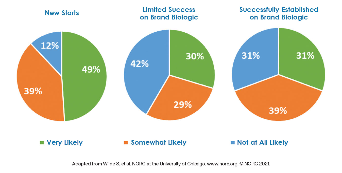 Another study of 602 physicians found that >75% believed that biosimilars are just as safe and effective as their originator counterparts. However, a substantial proportion of the surveyed physicians were uncomfortable with switching patients from a reference biologic to a biosimilar. While about half indicated that they were very likely to prescribe a biosimilar to a patient just starting biologic therapy, only 31% were very likely to prescribe a biosimilar to a patient responding to a reference biologic (Figure).2