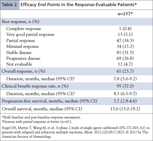 A series of phase 2 studies have demonstrated the clinical efficacy and safety of single-agent carfilzomib as a salvage therapy for patients with multiple myeloma (MM).5-8 An open-label, multicenter, single-arm phase 2 pilot study (PX-171-003-A0) of single-agent carfilzomib was conducted in 46 patients with relapsed and refractory multiple myeloma (RRMM) at a dose of 20 mg/m2 administered IV twice weekly for 3 weeks followed by 1 week of rest in each 28-day treatment cycle.5 In this pilot study, 7 of 42 response-evaluable patients achieved a partial response for an overall response rate (ORR) of 16.7%. The treatment was well tolerated with manageable toxicities.