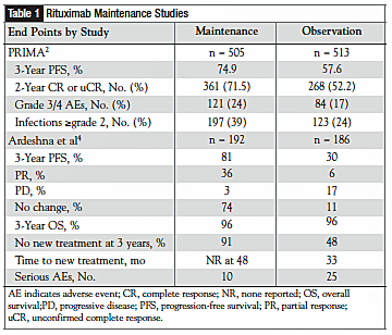 For asymptomatic patients with nonbulky FL, many clinicians believe watchful waiting is superior to chemotherapy. As research on less toxic and effective therapies such as rituximab continues to emerge, clinicians are questioning the watchful waiting approach. For example, Ardeshna and colleagues reported results of a clinical trial comparing ri tuximab induction therapy followed by rituximab maintenance versus observation for nonbulky FL grades 1-3a (Table 1). Preliminary results are encouraging, with patients in the rituximab arm achieving a significant delay in the need to initiate new therapy compared with those in the watchful waiting arm (P <.001; 95% CI, 0.13-0.29).4 Im prove ments in more clinically relevant end points, such as PFS and OS, have not yet been observed.