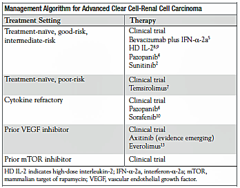 To summarize, sunitinib, pazopanib, or bevacizumab-IFN are preferred firstline agents for good- and intermediaterisk CC-RCC, whereas temsirolimus is preferred for patients with poor-risk disease. HD IL-2 retains its role in a wellselected, good-risk subset. Phase 3 trials under way include tivozanib versus sorafenib (Nexavar) and axitinib versus sorafenib. Other ongoing studies are evaluating adjuvant therapy with VEGF and mTOR inhibitors.