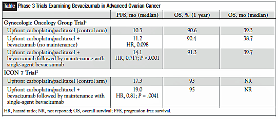 Bevacizumab Preliminary results from 2 eagerly awaited phase 3 randomized studies examining a potential role for the antiangiogenic agent bevacizumab in the primary management of advanced ovarian cancer were presented at separate international cancer meetings (Table).1,2 The first study was presented at the 2010 annual meeting of the American Society of Clinical Oncology. Investigators with the Gynecologic Oncology Group (GOG) sought to assess the utility of this drug combined with standard cytotoxic agents as an initial therapeutic strategy or as part of an initial strategy and then continued as maintenance therapy. Patients were randomized to 1 of 3 arms: standard chemotherapy with carboplatin and paclitaxel (the control arm); initial therapy with bevacizumab, carboplatin, and paclitaxel but no maintenance therapy; and initial therapy with bevacizumab plus the same 2 chemotherapy agents followed by 16 cycles of bevacizumab alone as a maintenance strategy.1 The administration of bevacizumab with carboplatin/ paclitaxel followed by bevacizumab monotherapy for 12 months of maintenance therapy following chemotherapy discontinuation resulted in statistically significant improvement in progression-free survival (PFS) compared with chemotherapy alone.