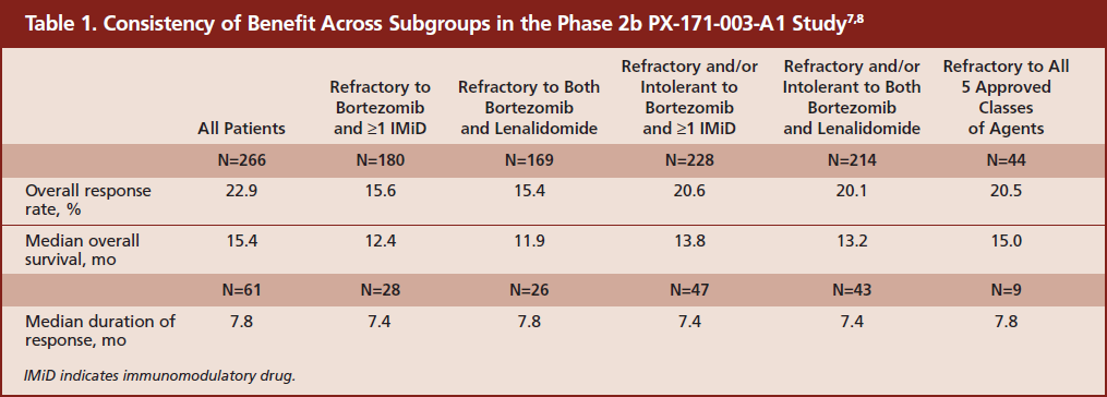 The ORR for all 266 patients was 22.9%, with a DOR of 7.8 months.7,8 Median OS for these patients was 15.4 months. Consistency of benefit for all these measures was demonstrated across many clinically important subgroups as well, including those patients with disease refractory to either bortezomib or lenalidomide in any prior regimen, refractory to both bortezomib and lenalidomide, and refractory to all 5 approved classes of agents (corticosteroids, proteasome inhibitors, IMiDs, alkylating agents, and anthracyclines) (Table 1).7,8