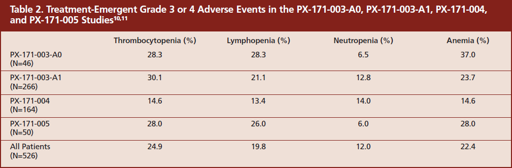 Overall, 370 patients (70.3%; range, 65.2%-89.1%) experienced a hematologic AE, with no deaths due to hematologic AEs across all 4 studies.10,11 Table 2 shows the treatment-emergent grade 3 or 4 hematologic AEs experienced by patients enrolled in these studies. Clinically significant grade 3 or 4 cytopenias were both infrequent and transient. While all 4 studies permitted entry of patients with cytopenias at baseline, dose reductions or discontinuations were rare. Of the 78 patients who discontinued therapy due to an AE, only 9 were due to a cytopenia. Of the 77 patients who required a dose reduction due to an AE, only 14 were due to a cytopenia.